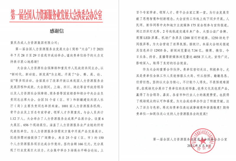 26日,第一届全国人力资源服务业发展大会执委会向贝博艾弗森官网集团发来感谢信,对贝博艾弗森官网集团在大会期间的各项工作表示肯定,对各分项活动的协助和支持表示感谢。